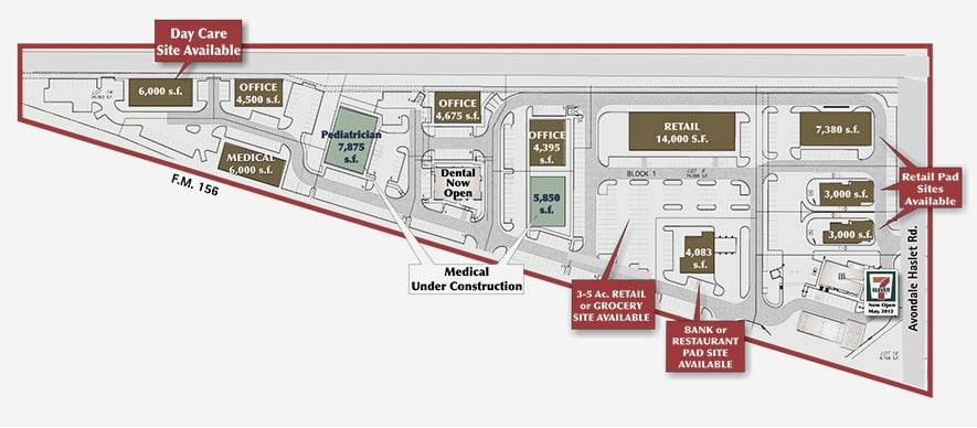 The first phase will offer an upscale office park environment allowing businesses to have a combination of either office, showroom or warehouse space. The second phase will showcase prime retail use property located just half a mile from Gaylord Texan Resort and Convention Center.
